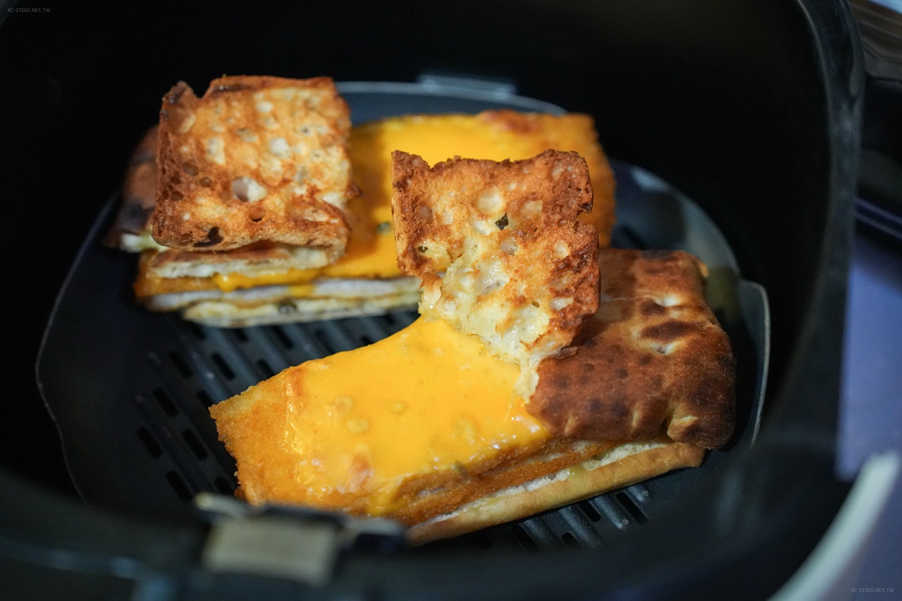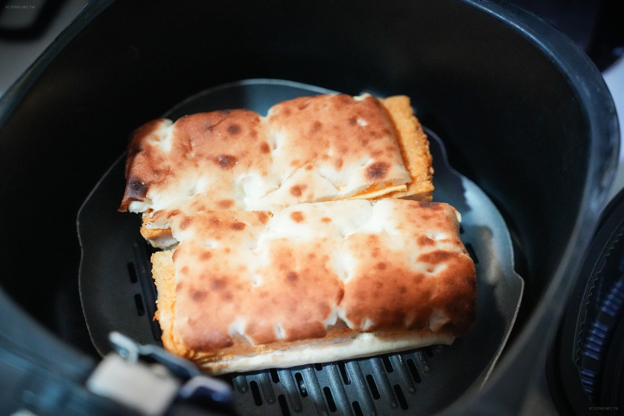 不知道是不是麵包本身的材質太輕,居然被氣炸鍋的熱風掀翻吹斷了 =_=