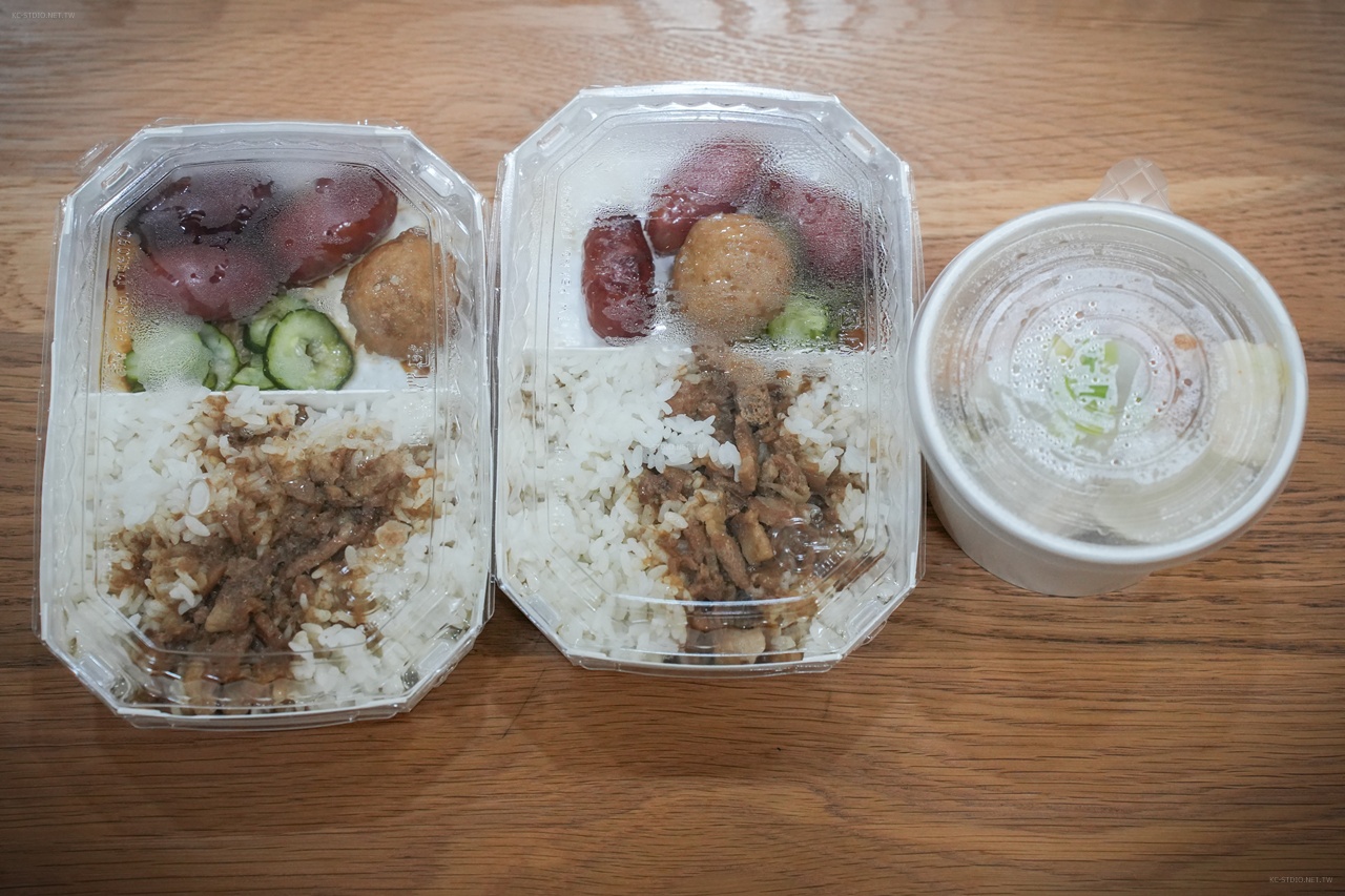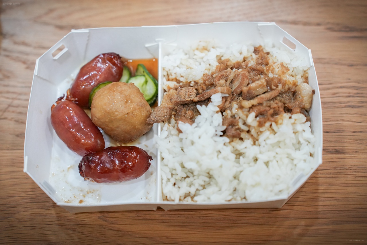 小碗(半盒)滷肉飯+三顆小香腸+一顆魯貢丸+幾片小黃瓜….