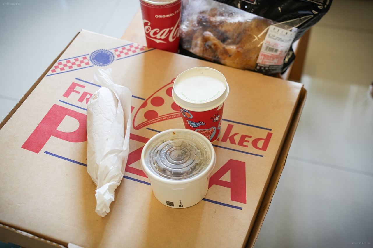 pizza盒兩個圓柱體就是焢肉飯&蘿蔔湯,剛好拿pizza跟旁邊的熱狗當比例尺