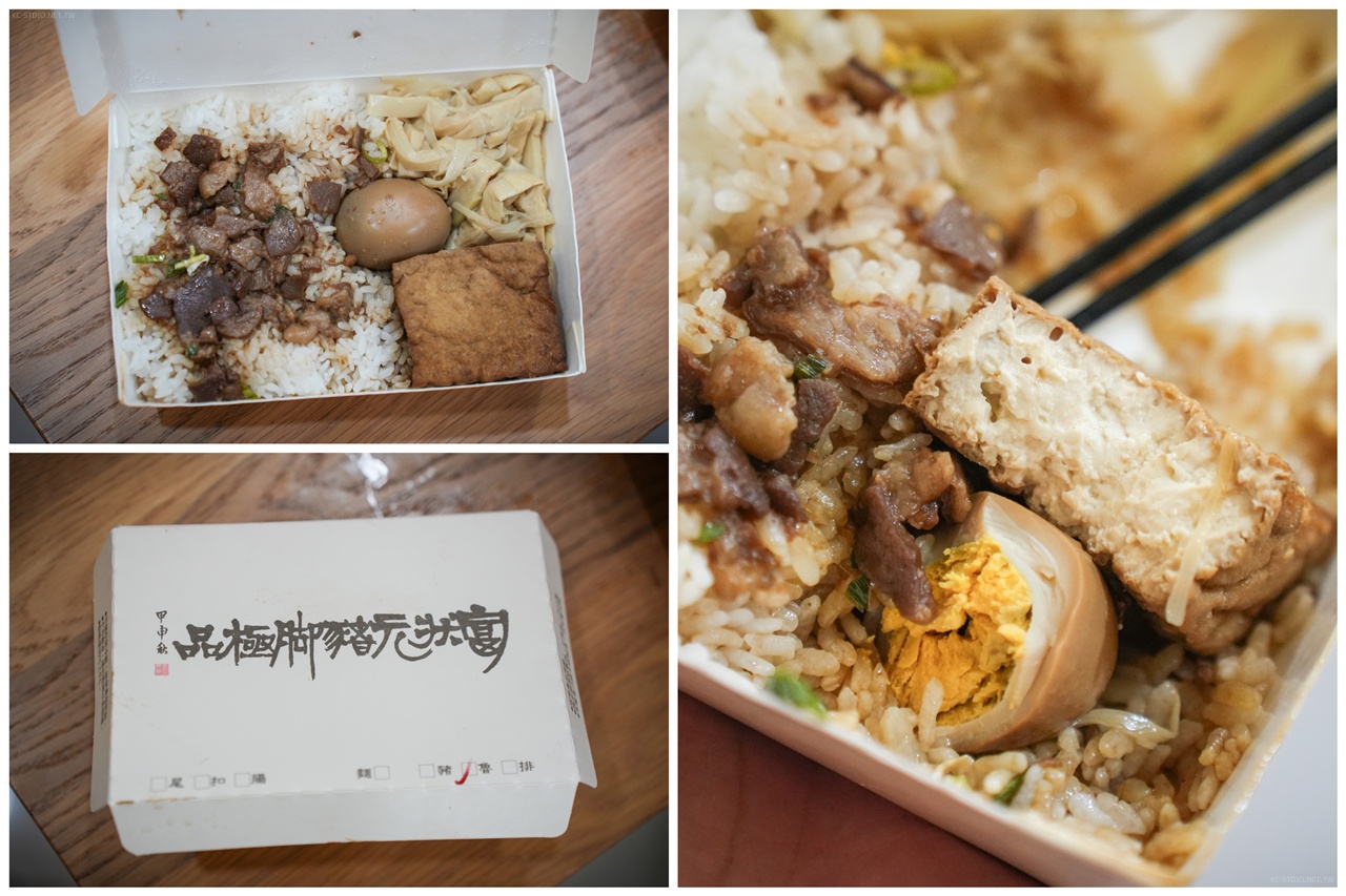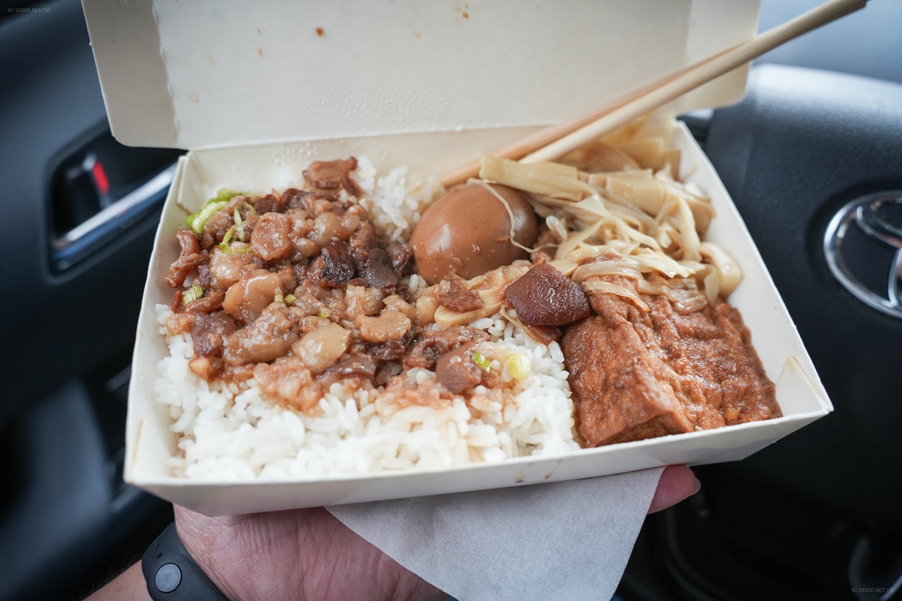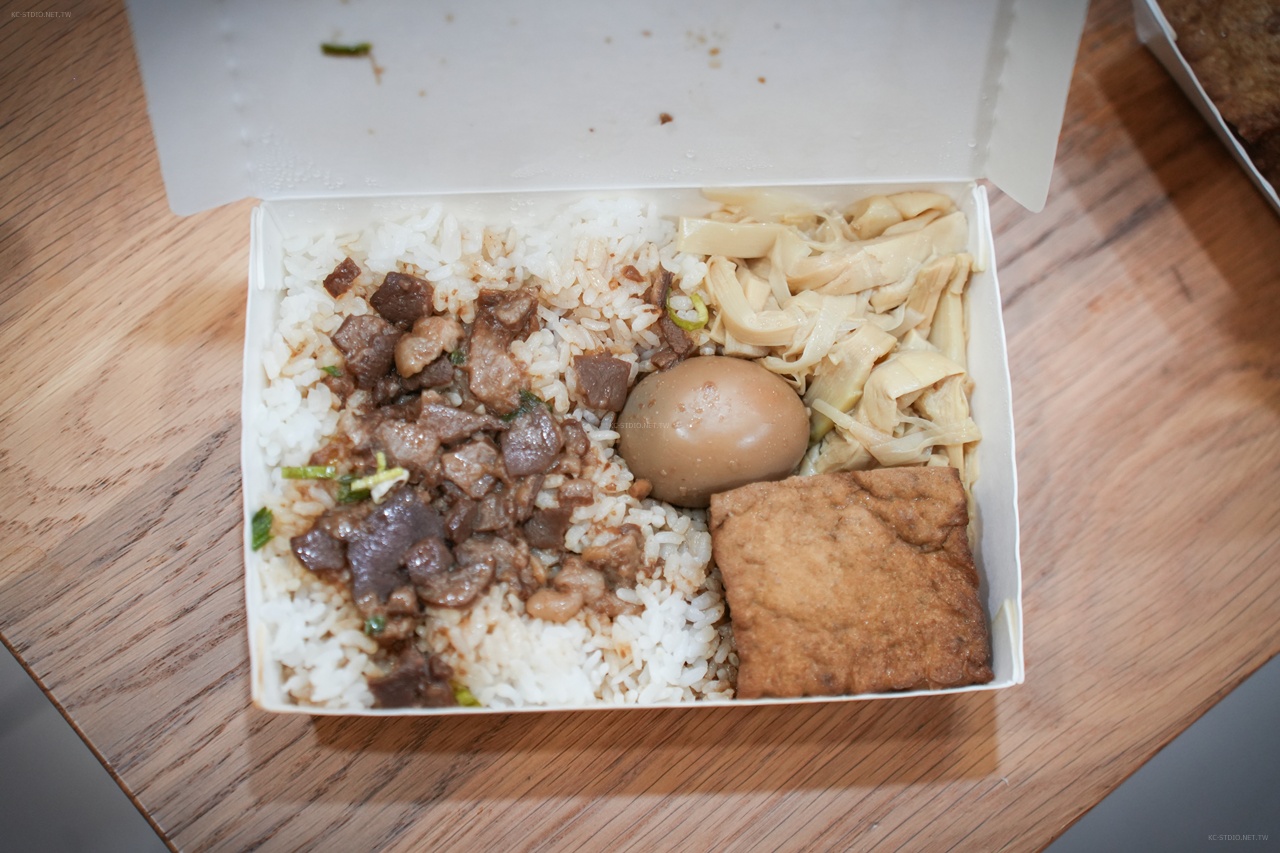 內容物有魯肉飯 + 滷蛋 + 大塊油豆腐 + 筍乾。
