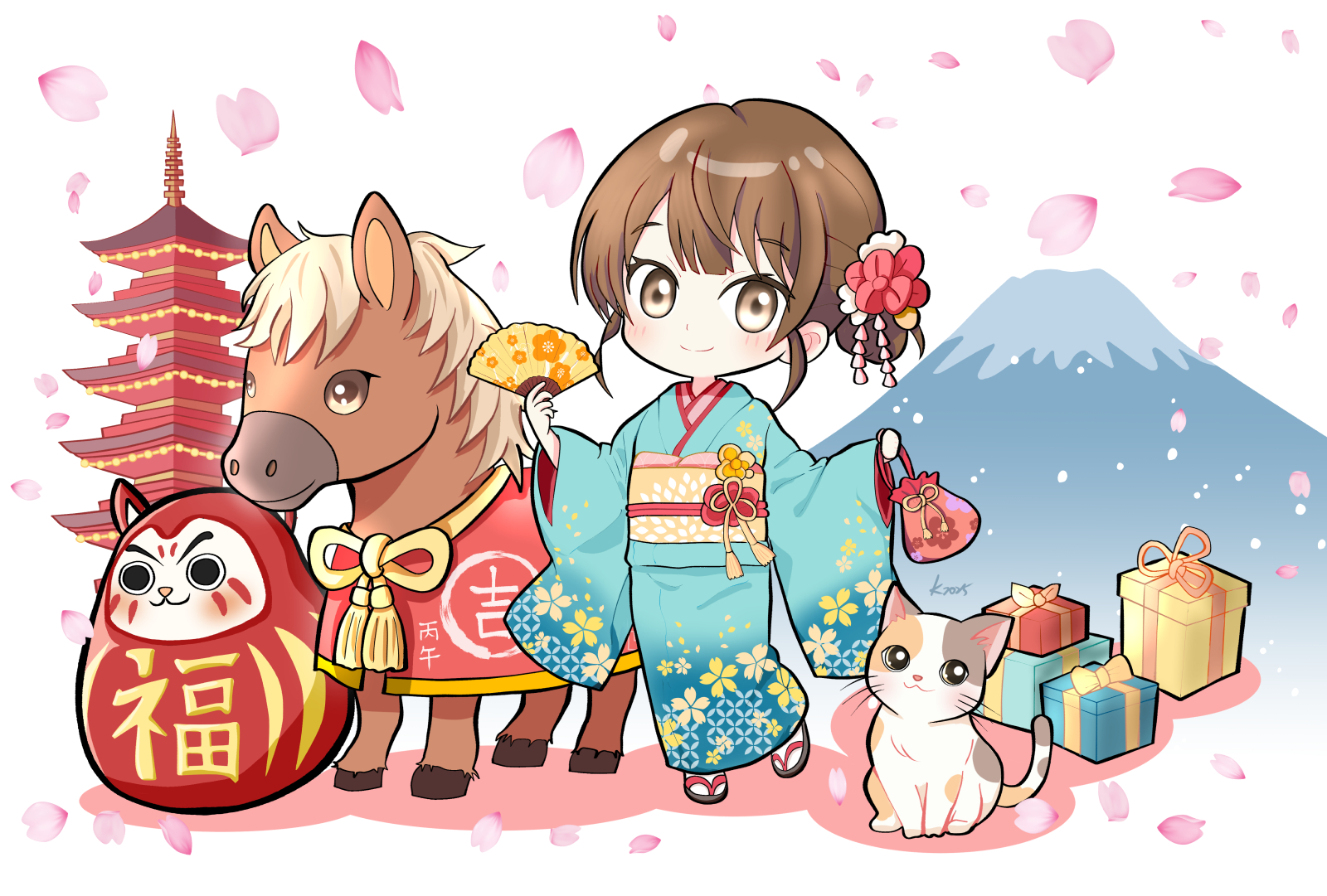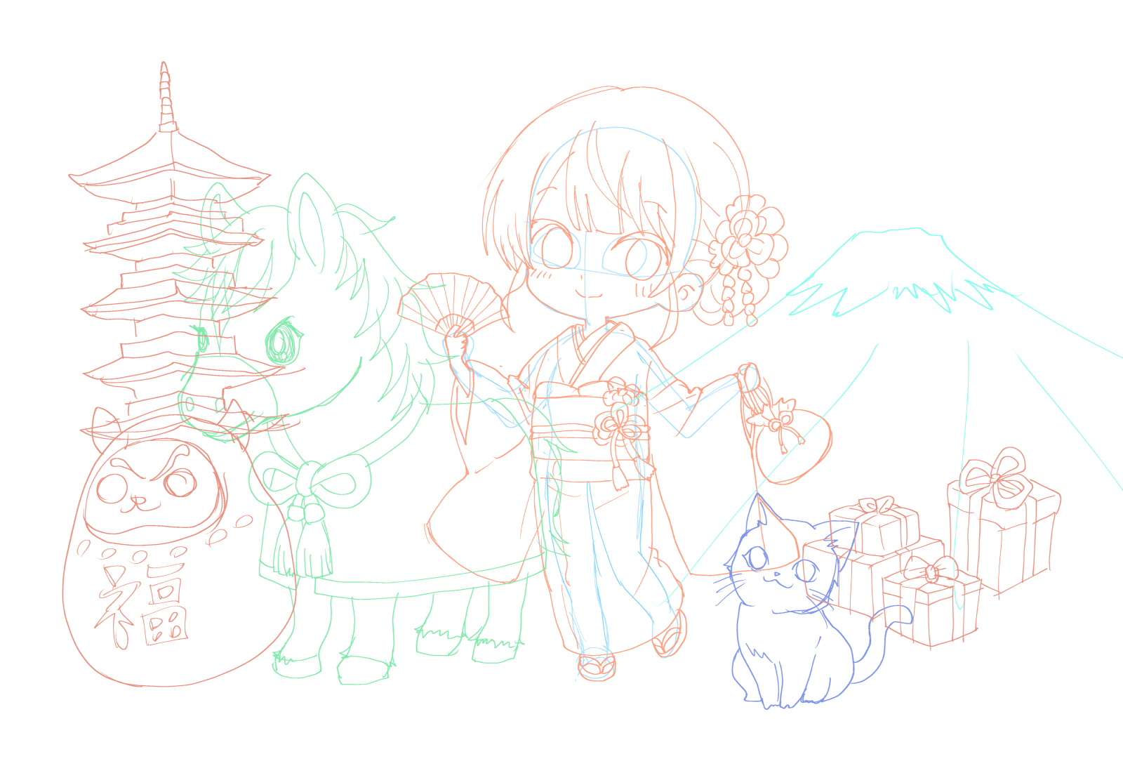 和服女孩、馬、(招財)貓、富士山、達摩(不倒翁)、神社(後來決定用五重塔)